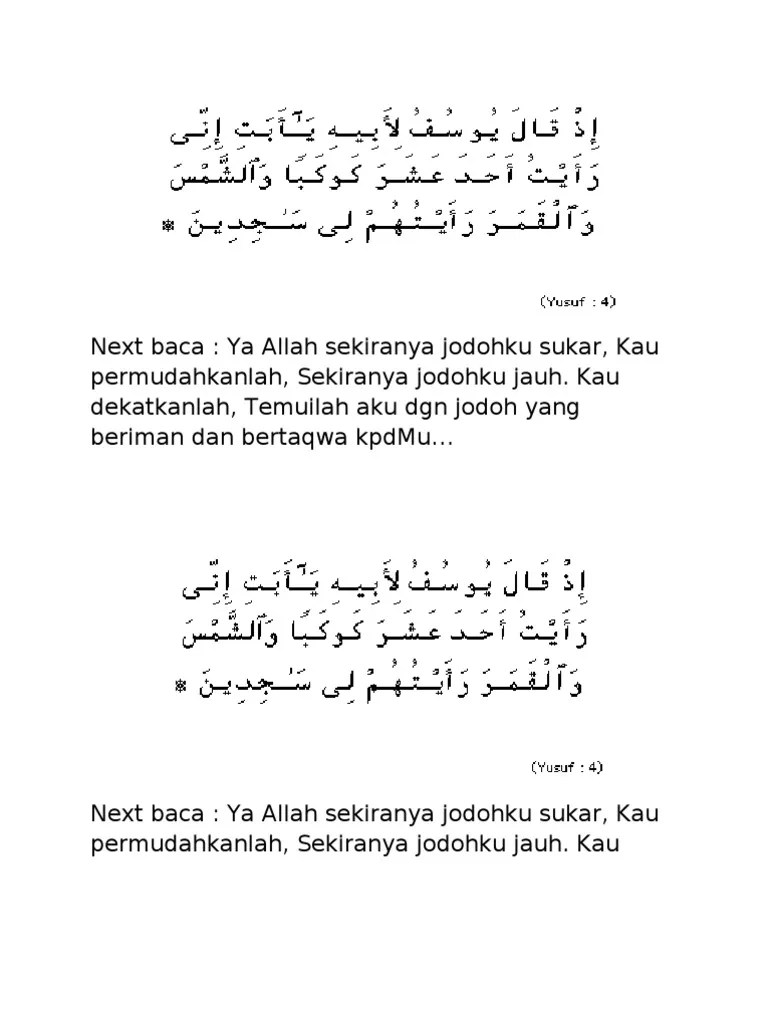 Percayalah jika allah swt sudah mempersiapkan jodoh yang tepat untuk anda. Antara doa yang boleh diamalkan untuk mendapat jodoh adalah melalui petikan ayat dari … Mereka yang ingin segera menikah dan dipilihkan pasangan yang baik untuk menjalani biduk rumah tangga yang sakinah, mawaddah dan rahmah juga perlu berdoa meminta jodoh kepada allah swt. Doa meminta jodoh pun … Kita tidak dapat memandang remeh atau menolak tentang pengamalan …